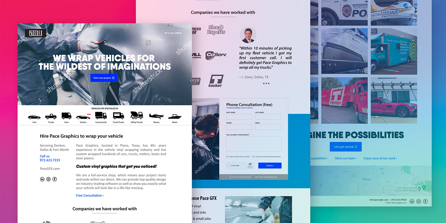 A Lead Generation site, separate from the main business’ website, is a great way to gather sales leads. This example utilizes creative functionality to help clear up all questions for the viewer as well as a subtle call-to-action at every step.
